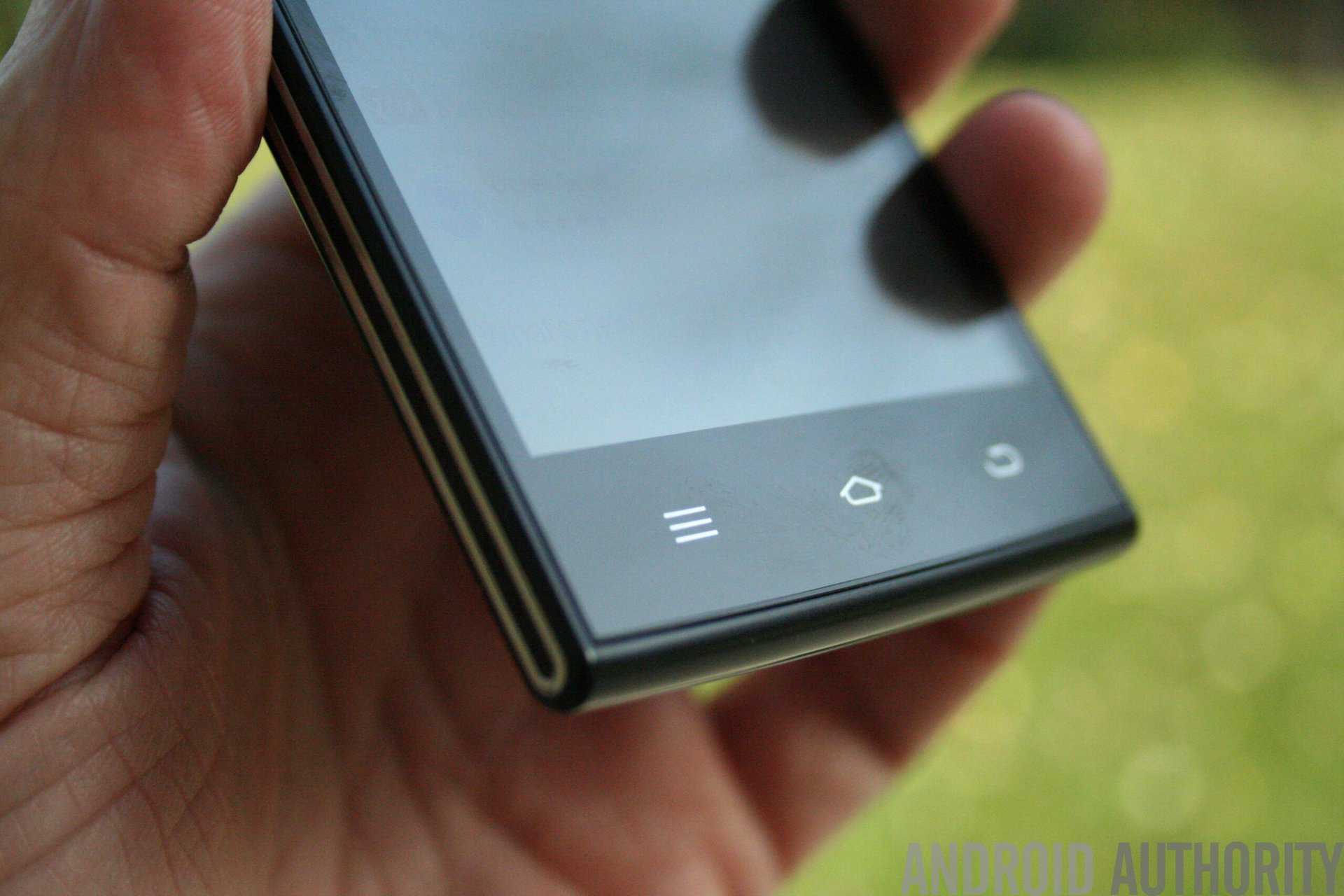 On the front is the 720p HD display, with three capacitive buttons on the bottom (menu, home and back). Toward the front top edge is the speaker grill and the front facing camera. Looking around the sides, the power button is on the right, and the volume rocker is on the left. The power button can be easily reached by your index finger when held in your left hand. On the top is the micro USB port and the headphone jack. On the bottom is a small thumbnail space to help prise off the back cover, it also acts as the gap in the outer shell for the microphone. For a little bit of decoration the phone has two metal bands running down each side.