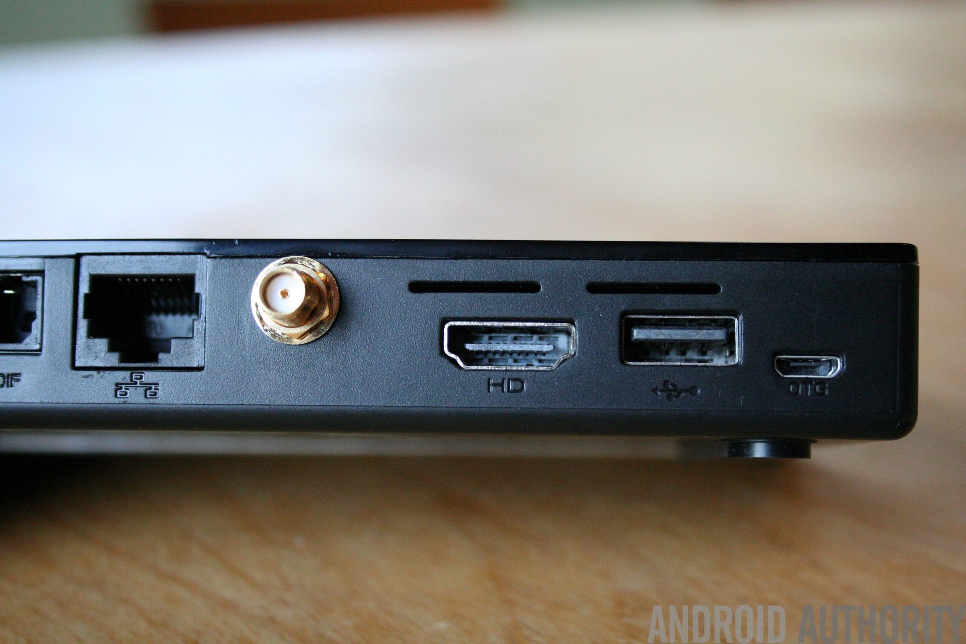 The design of the Orion R28 is quite simple. It is a small black box with an array of connectors and ports. It is powered by an external power supply and connects to your TV via HDMI. On the front is a small glass window for the remote control sensor and on the top is the power button and the box’s branding. On the back is the HDMI port, the connector for the Wi-Fi antenna, the power connector, an Ethernet port, a 3.5mm AV jack port, a “normal” USB port, and an OTG micro USB port. There are two more USB ports on the side along with a micro SD card slot.