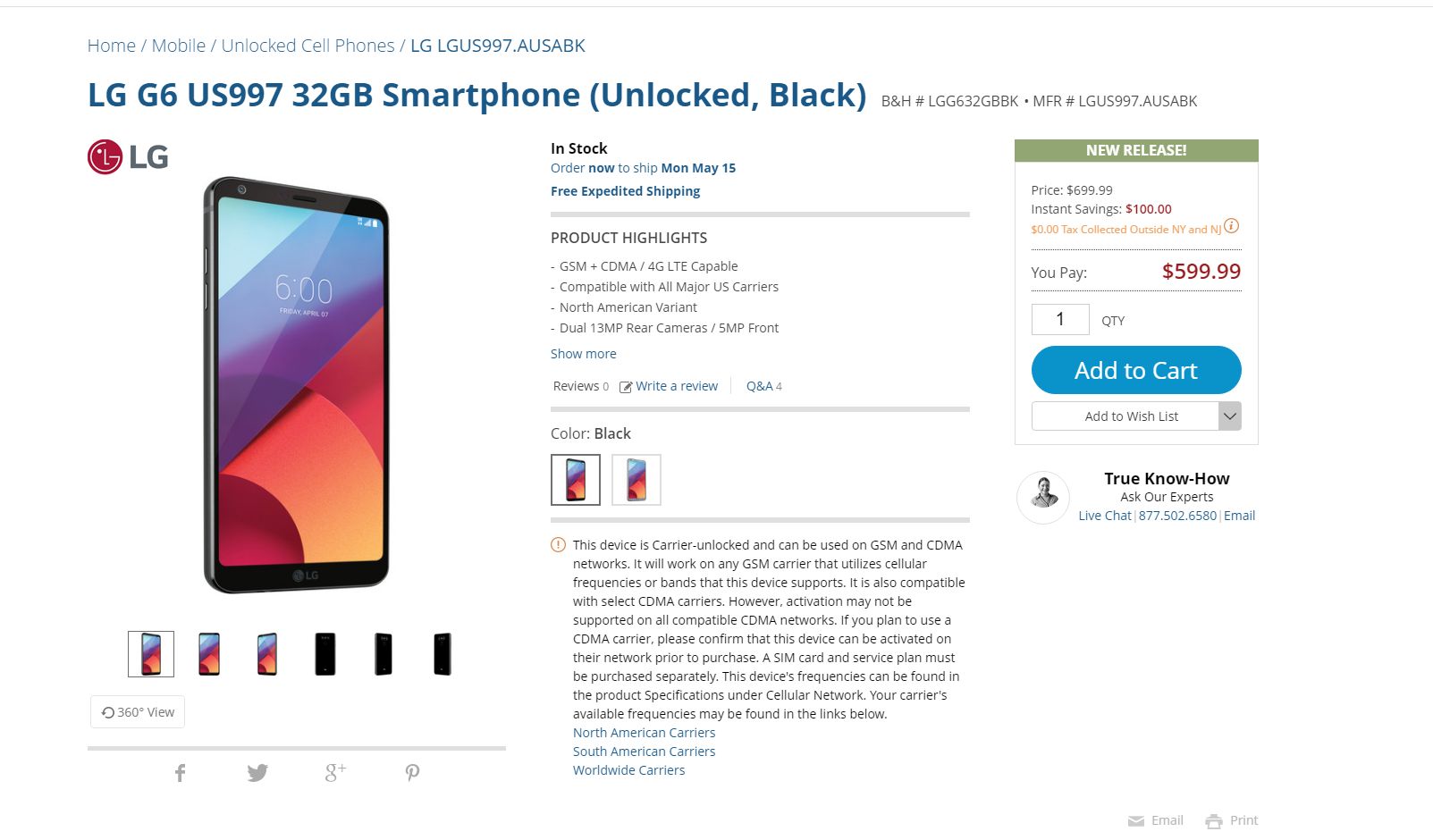 After first taking pre-orders for the phone in late April, B&H Photo is now officially selling and shipping the unlocked US version of the LG G6. The price for the phone is $599.99, which is supposed to be a $100 discount from its normal $699.99 price tag.