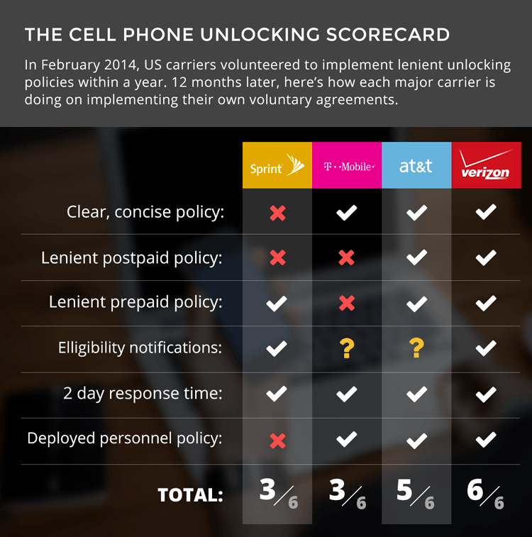 Sina Khanifar, a consumer rights activist who was a big advocate against phone unlocking restrictions, has rated the four major US carriers (Verizon, AT&T, Sprint and T-Mobile) on phone unlocking restrictions after the agreements passed. Unfortunately, he found that three of the four carriers are still not complying with all regulations set forth by the FCC.