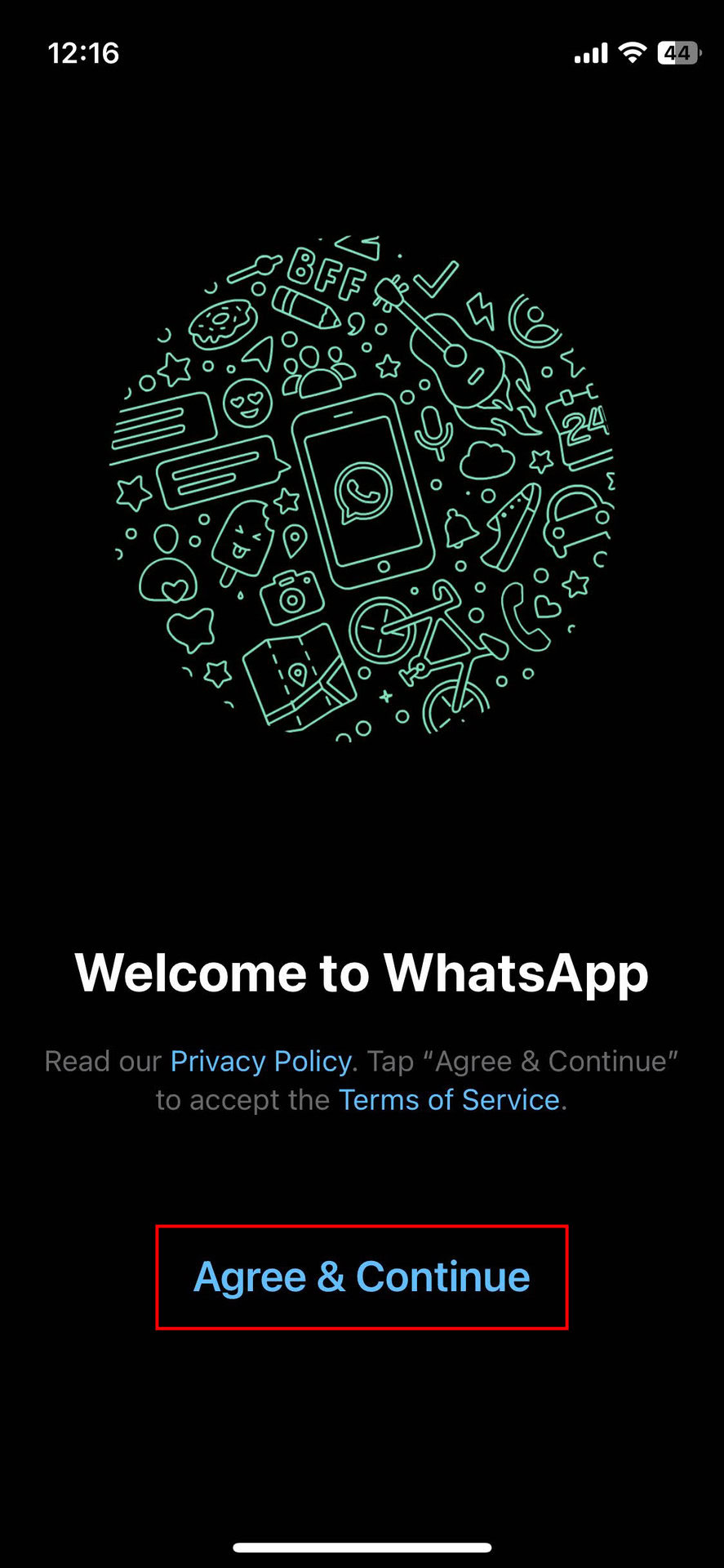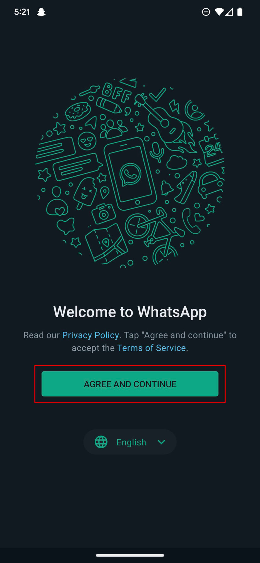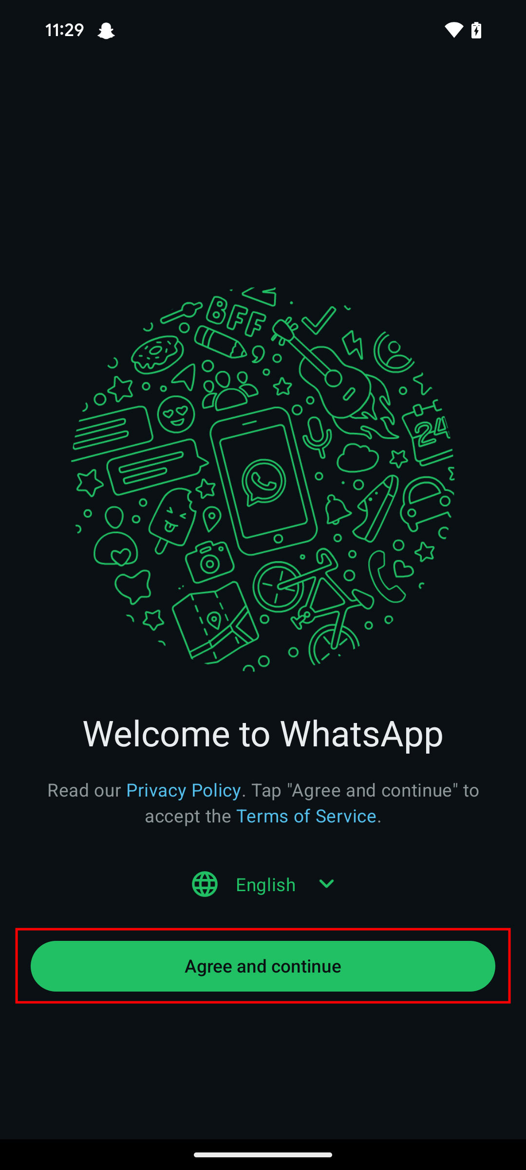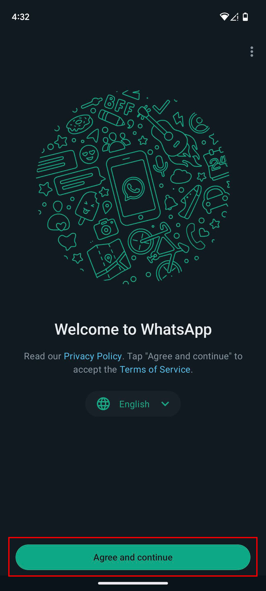 - Pick your language, then read the privacy policy and terms of service offered by the welcome screen.