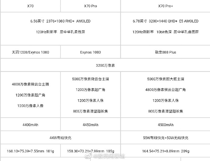 The vivo X70 series is launching later this week, but a new leak seemingly reveals the three phones’ core specs well beforehand. Weibo tipster Digital Chat Station has published a table detailing the vivo X70 Pro Plus, X70 Pro, and standard X70 in a little more detail. Interestingly, the leak suggests that the three phones could be available with MediaTek, Samsung, and Qualcomm SoCs.