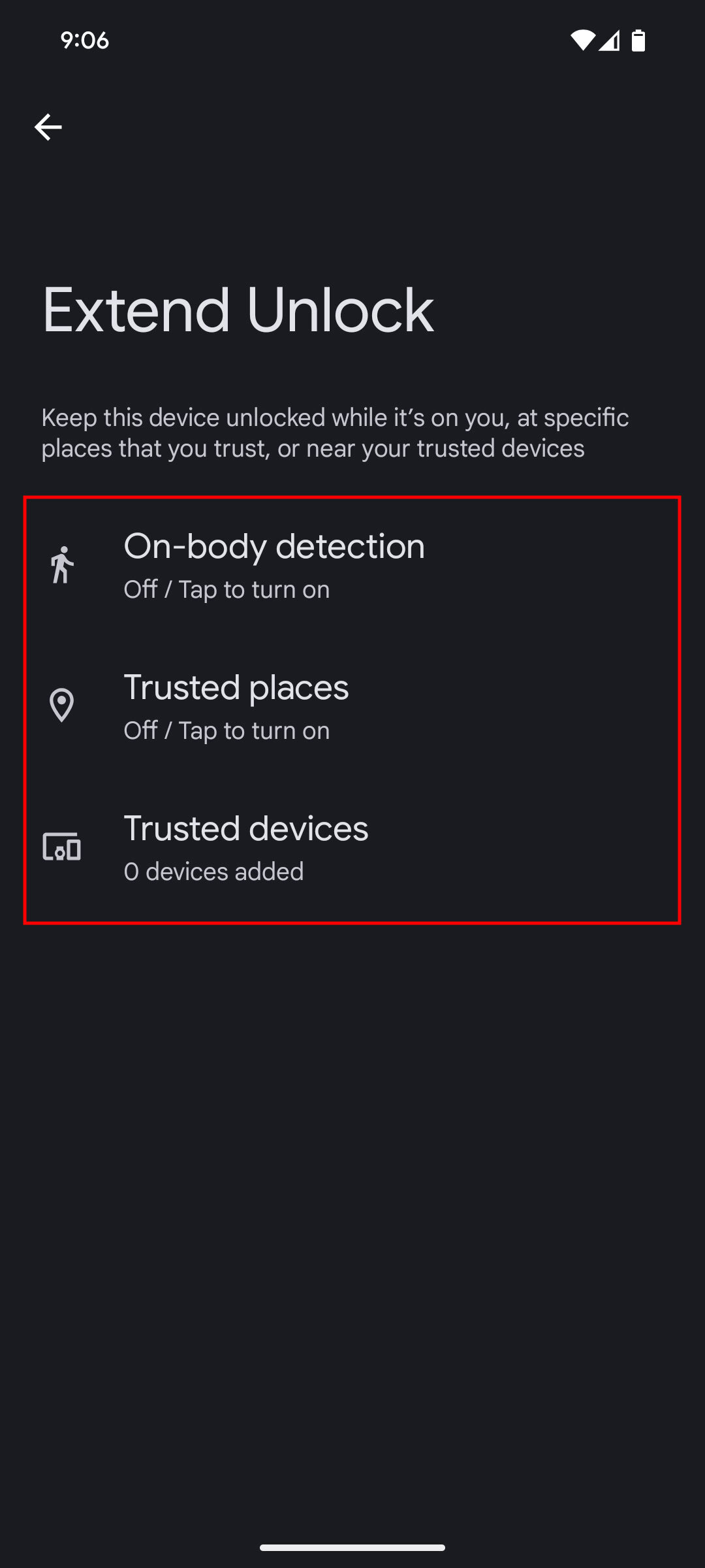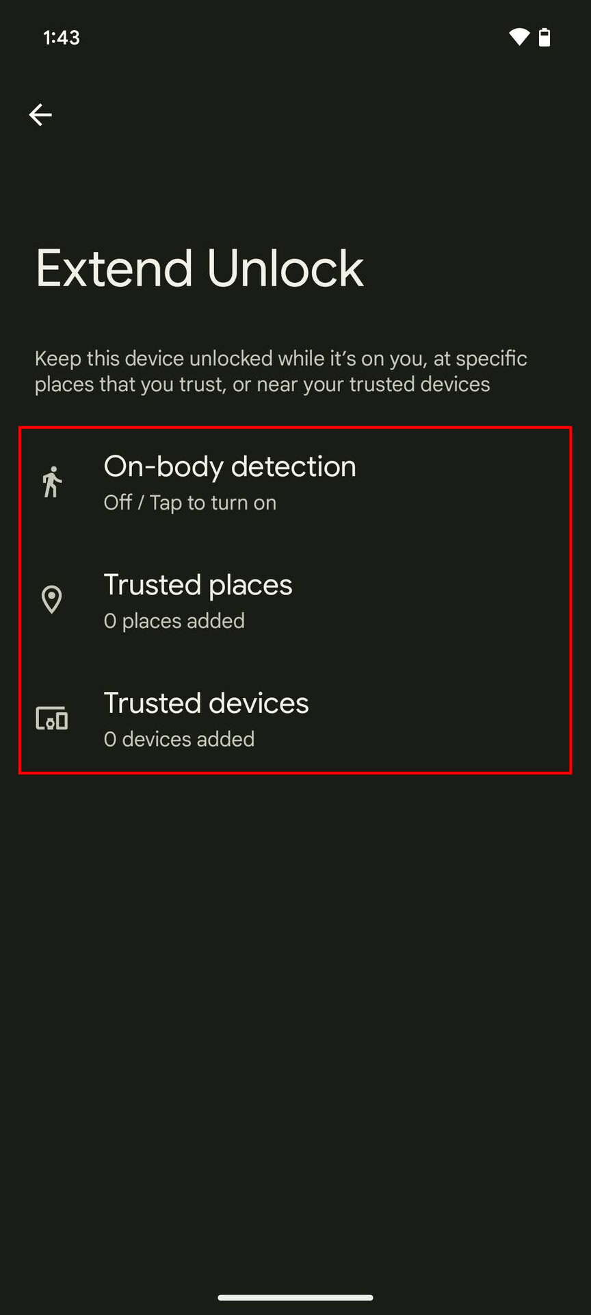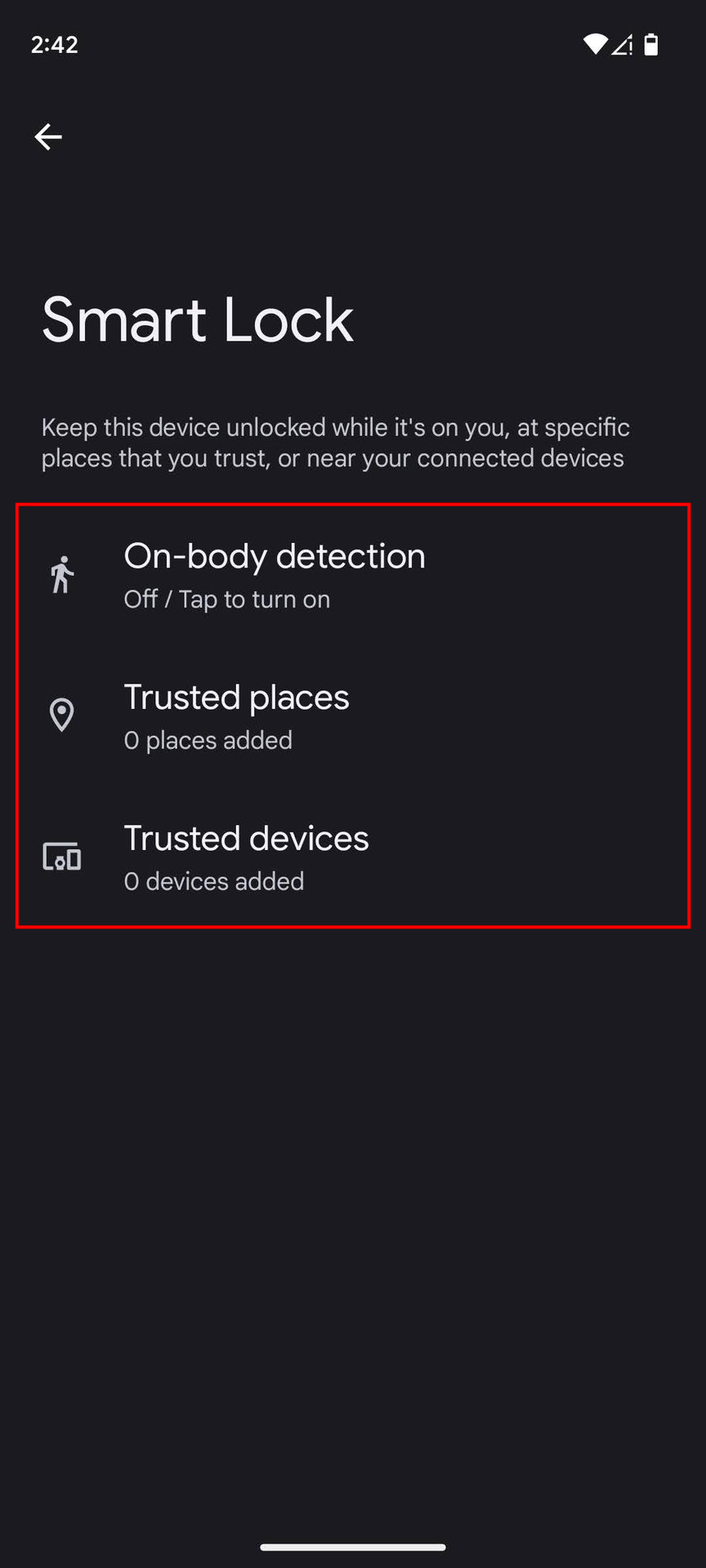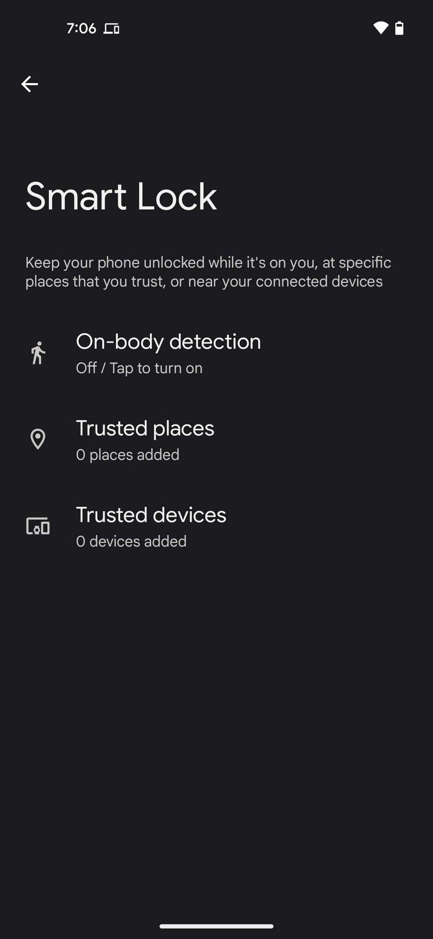 - Choose either On-body detection, Trusted places, or Trusted devices.