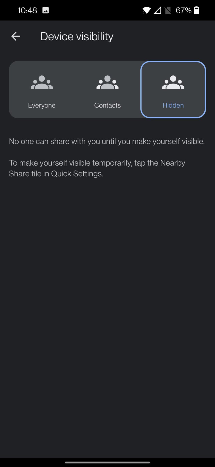 • Hidden: Hidden will hide your device and stop anyone from sharing files with you until you change your visibility settings.