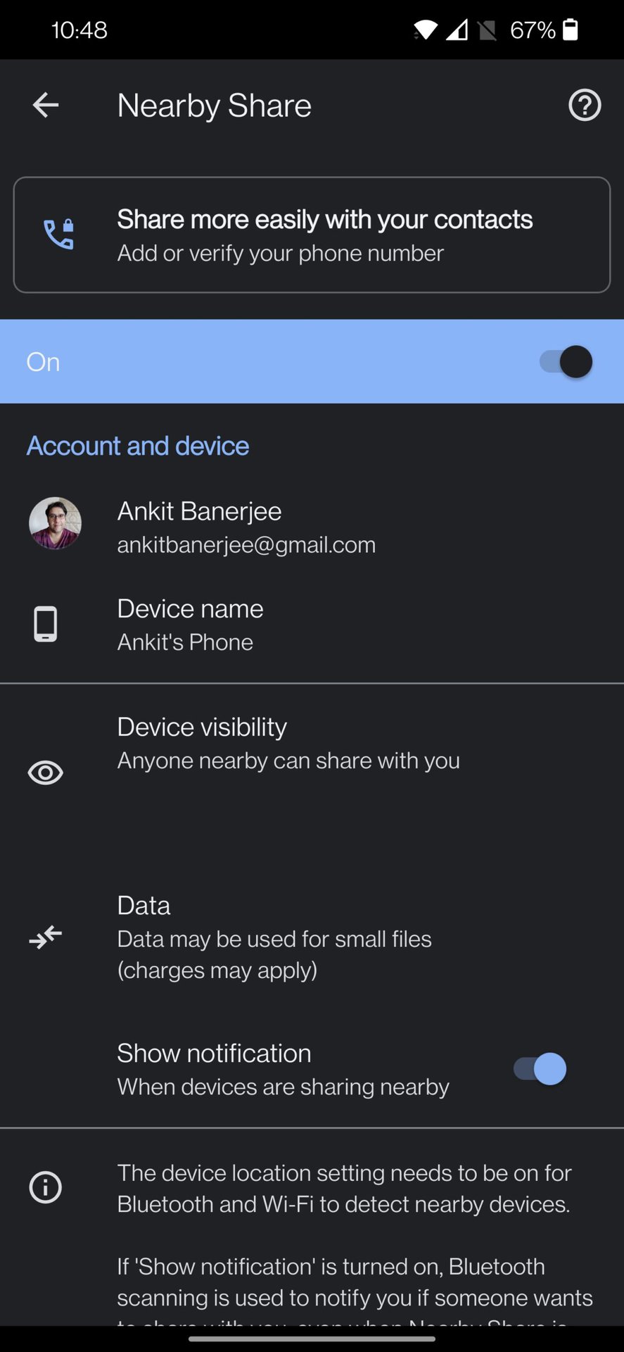 Finally, if you enable the Show notification setting, the phone will use Bluetooth to let you know when someone is trying to send a file to you, even if Nearby Share isn’t active.