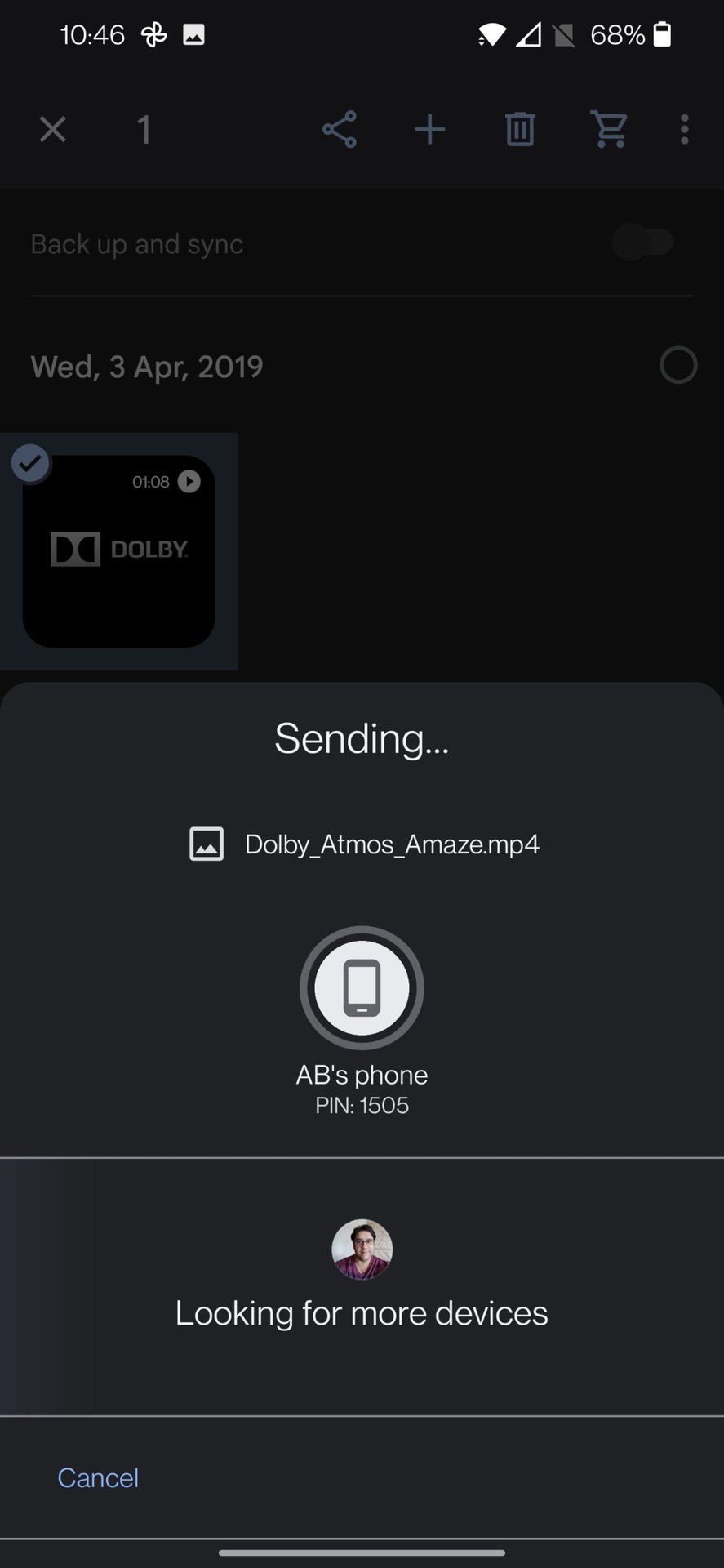 The phone will look for the other Android phone. Tap on its name when it pops up in the menu. Your phone will generate a four-digit PIN code that the other person can use to verify that you are sending the file.