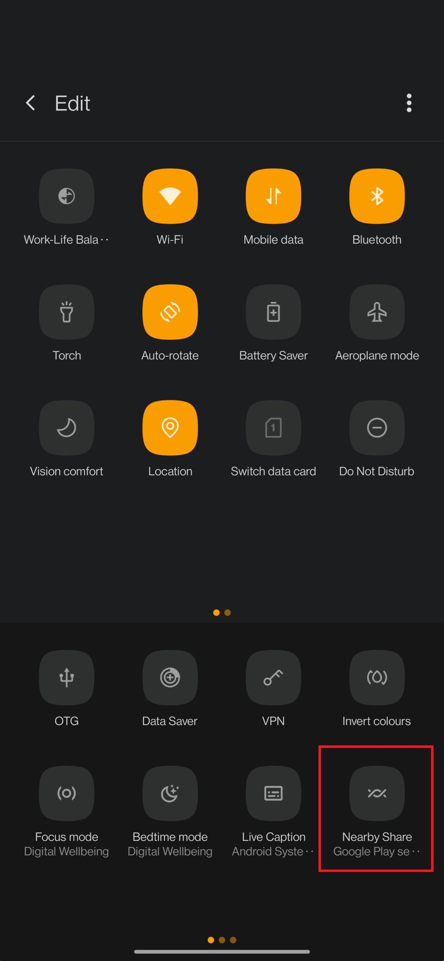 Frequent users might want to add a shortcut to their phone’s Quick Settings menu if it isn’t there already. Swipe down to open the Quick Settings menu and tap on the pen icon next to Settings. Look for Nearby Share on the list of additional toggles and drag and drop it into the shortcuts.