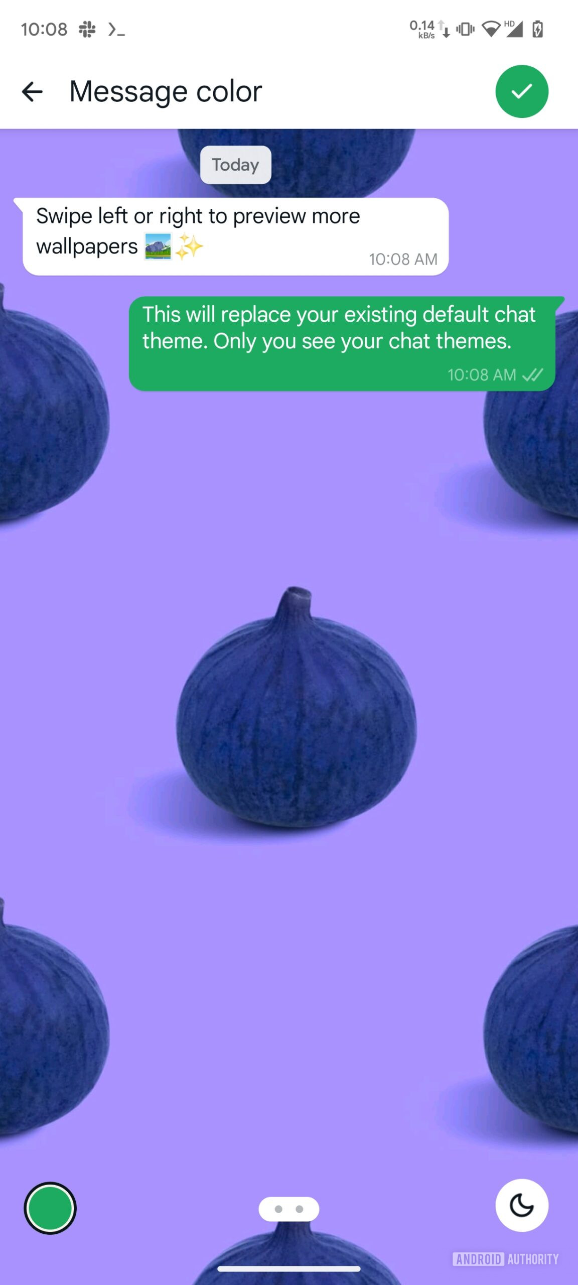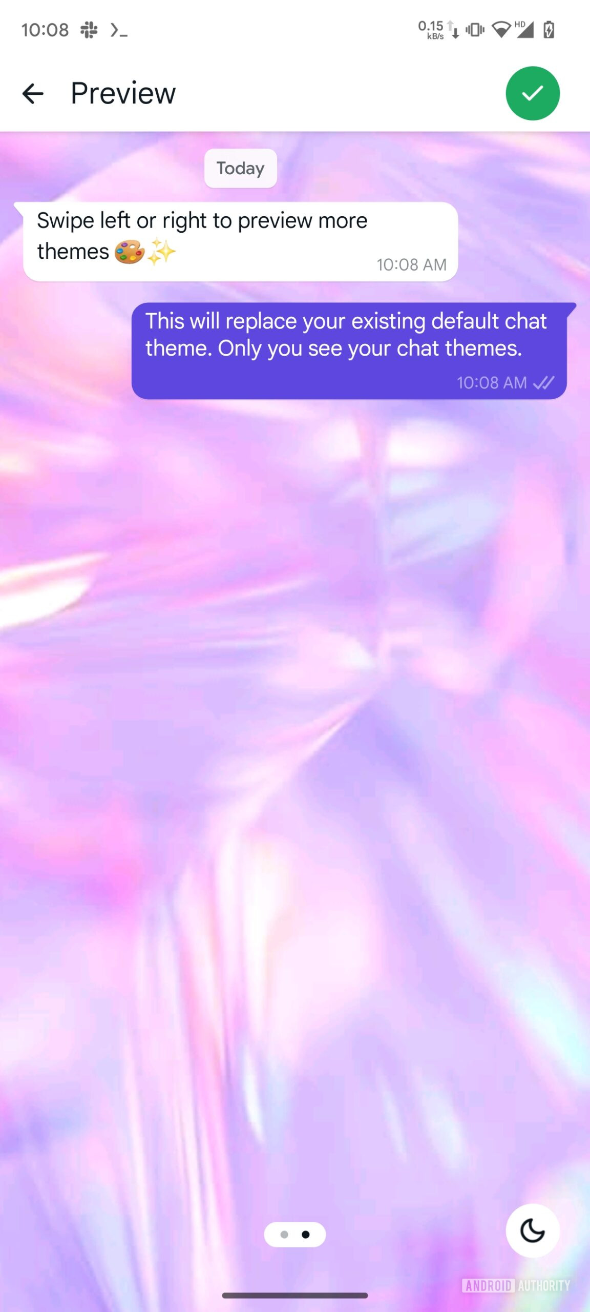 The selected theme will become your default chat theme and will be applied to all chats. You may be able to override the theme manually in specific chats. Also, note that the theme is visible only to you. Other participants in the chat will see the theme they set on their devices.