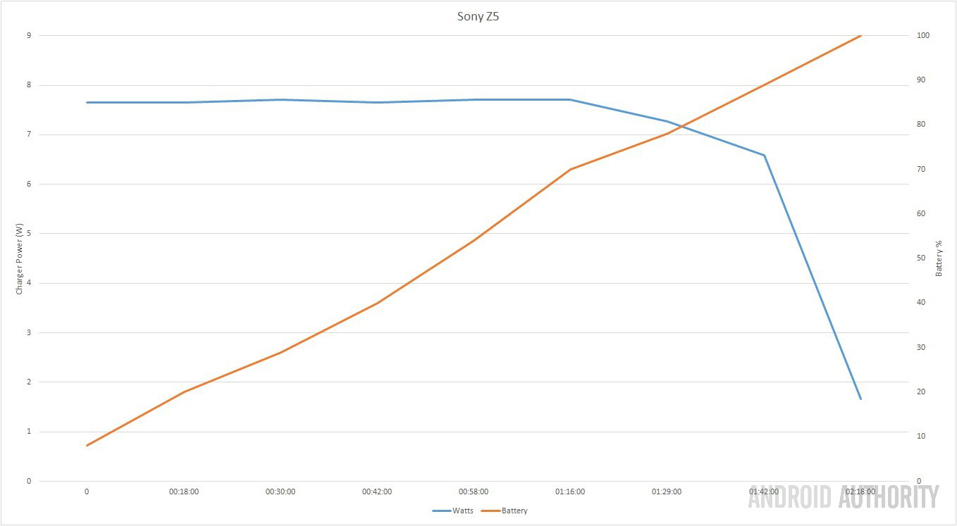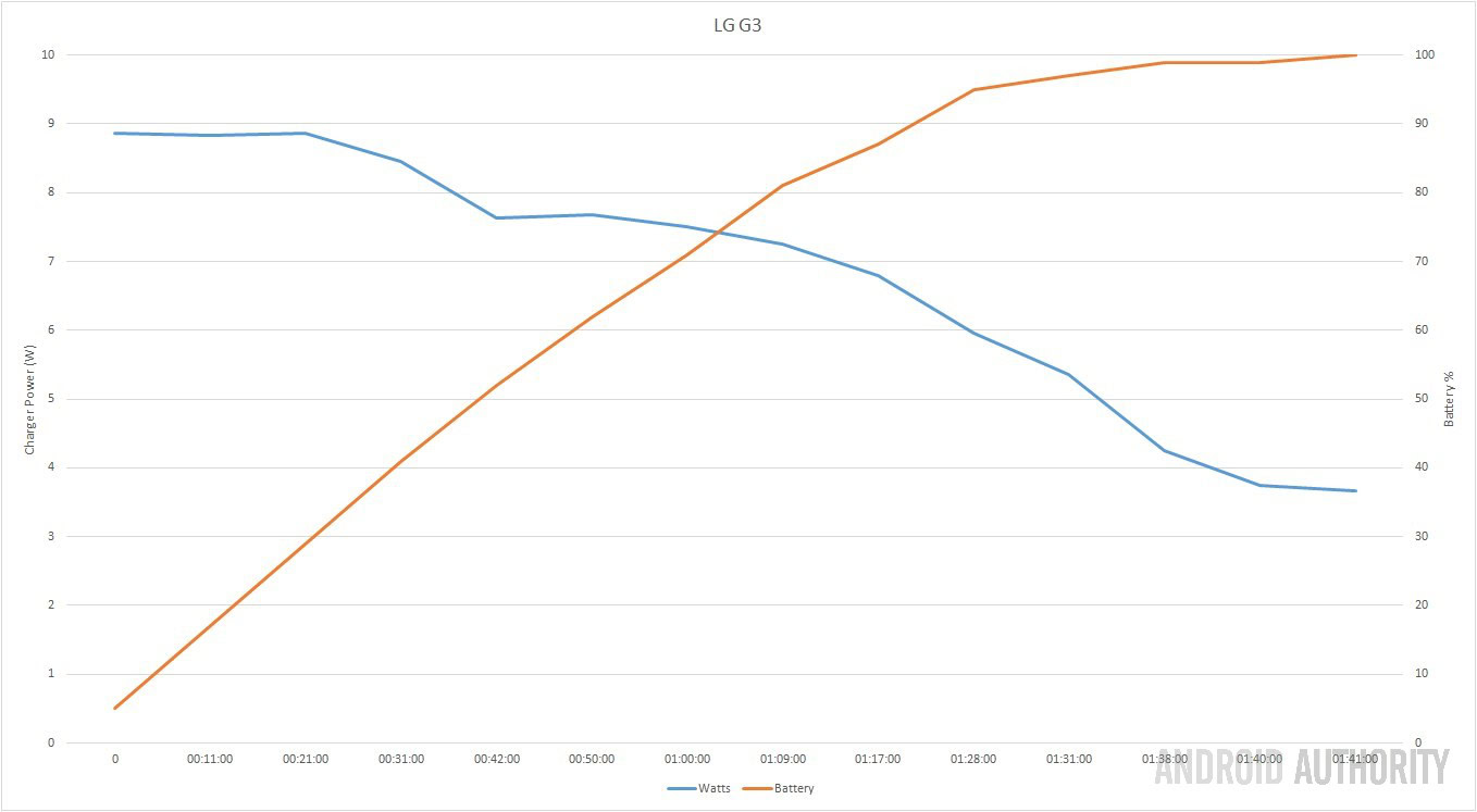 As you can see the battery is charged at 7.5 watts (5.1V, 1.46A) for over 90 minutes, then when the battery gets to around 80% full the watts decrease slowly until the battery reaches 100%. What is also interesting is that the battery is charged to 80% in about 65% of the total charge time, but to bring the battery up from 80% to 100%, takes another 45 minutes. This is of course because the wattage is lessening over time as the battery reaches 100%.