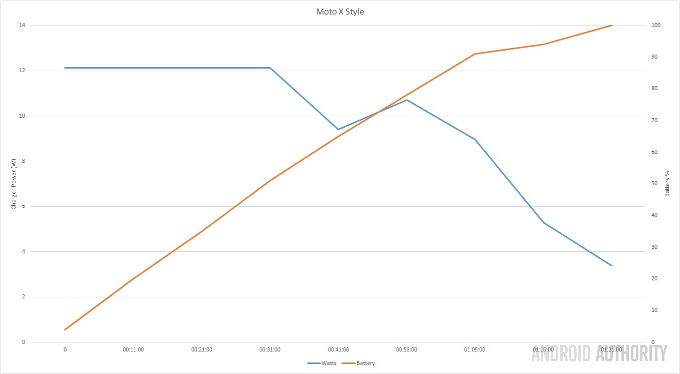 The phone with the most interesting charging cycle is the Moto X Force. It starts charging with 8.97V at 2.23A, which is 20 watts: