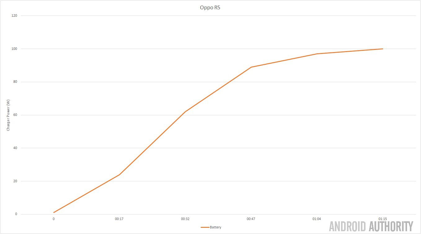 As for the OPPO R5, OPPO has a quick charging system called VOOC which is meant to operate at 5V and 4A (i.e. 20 watts). However we couldn’t get the R5 to use those levels in our testing, even when using a VOOC charger. And that is a shame, as it would have been interesting to see the charge time of the 2000 mAh battery of the R5, if it was charged at 20 watts!