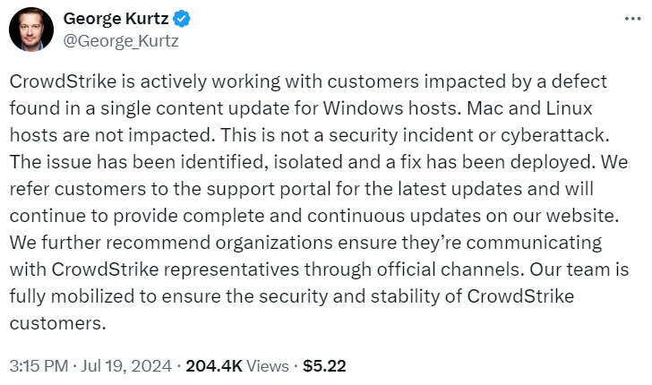 CrowdStrike CEO and President George Kurtz issued the following statement: