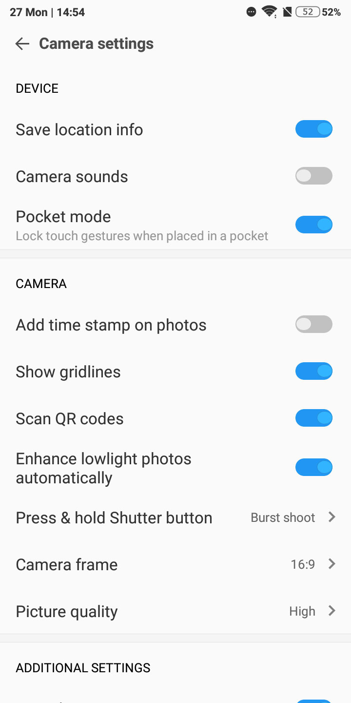 Other options here include changing what the volume button does when pressed (e.g. shutter, zoom, or a shutter countdown), a toggle to save location info, and more.