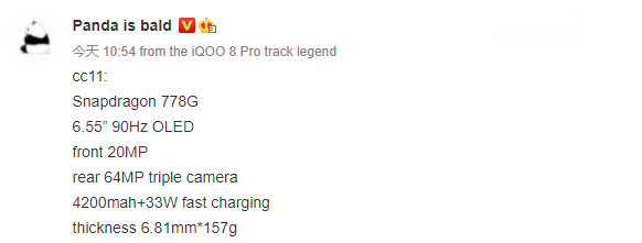 Weibo tipster Bald Panda posted apparent Xiaomi CC11 specs today, claiming that it’s equipped with a Snapdragon 778G chipset, a 6.55-inch 90Hz OLED panel, and a 4,200mAh battery with 33W charging. The leaker also claims that you’re getting a 64MP triple rear camera system and a 20MP selfie snapper.