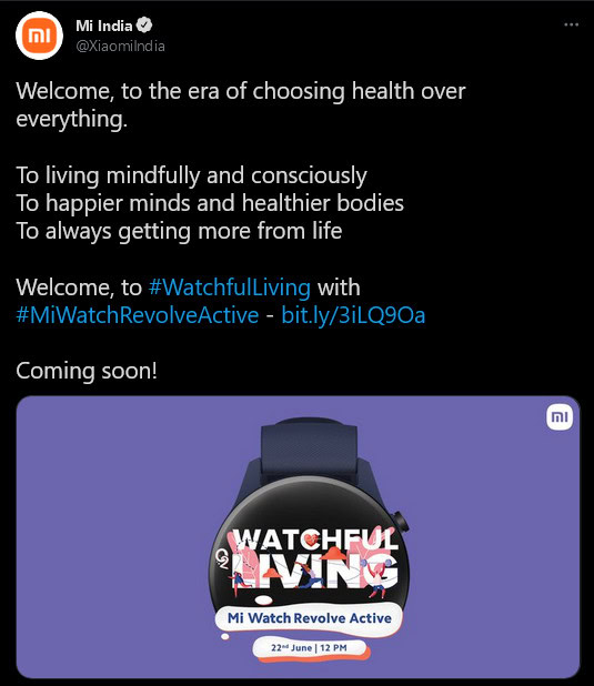 Update: June 14, 2021 (3:50 AM ET): Xiaomi has now confirmed the forthcoming launch of the Mi Watch Revolve Active in a Twitter post. The tweet links to an event page that confirms a few features of the watch, too.
