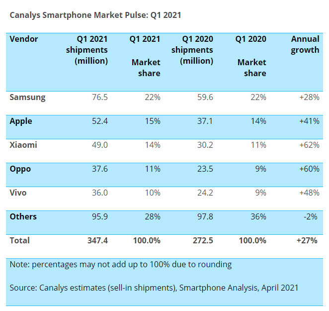 Canalys has released its Q1 2021 global smartphone marketshare report and it says Xiaomi has achieved its best-ever quarter, growing 62% year-on-year. The Chinese manufacturer was listed in third position with 49 million smartphones shipped, equating to 14% marketshare.