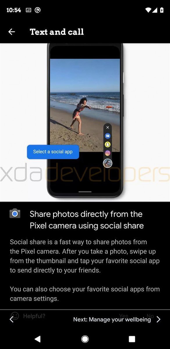 XDA-Developers got its hands on an updated Pixel Tips app, revealing a so-called Social Share feature in the Pixel 4 camera app. A screenshot of the feature explains that users can quickly share their most recent picture from the camera viewfinder by swiping up from the image thumbnail. You can then choose the desired app for sharing, making for a quicker way to share in theory than going into the gallery and using the sharing menu.
